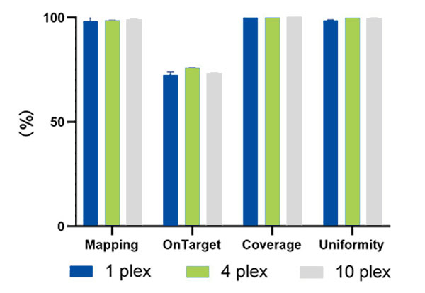 以血液gDNA为模板进行超声建库(Dynegene,NL1001),使用QuarXeq Human All Exon Probes 3.0探针及过夜杂交试剂(Dynegene,NC1003)进行单杂和多杂捕获。测序结果表明单杂和多杂下捕获效果均优异。
